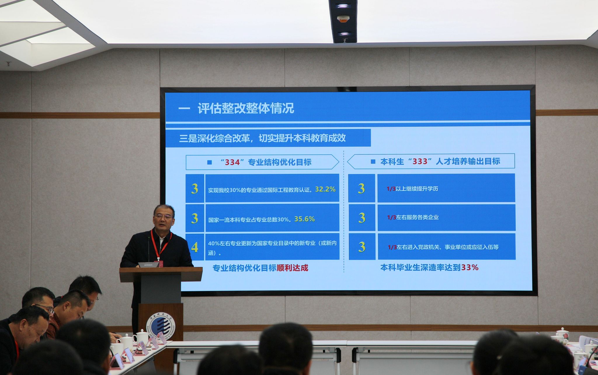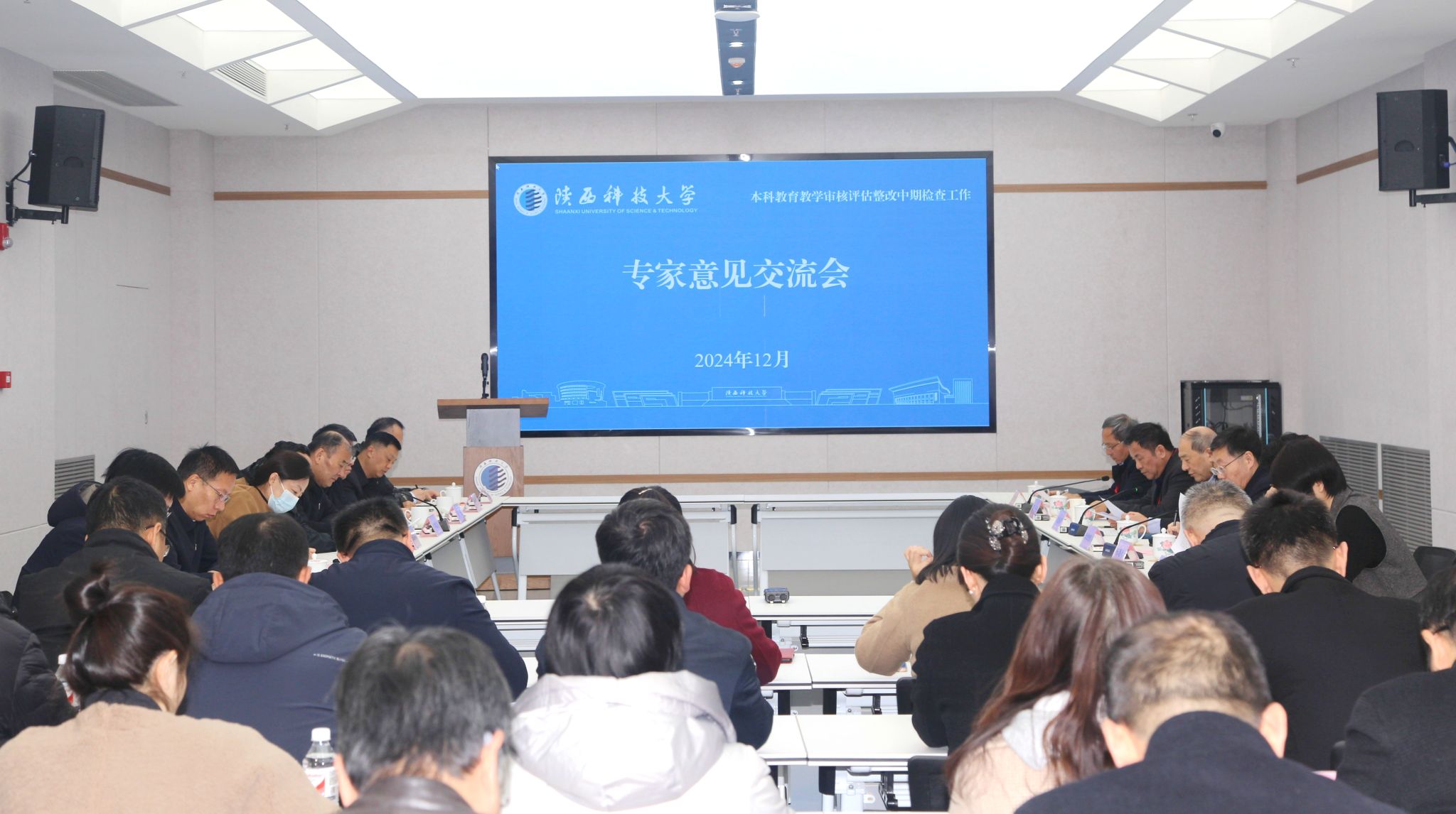12月5日下午,審核評估整改中期檢查專(zhuān)家意見(jiàn)交流會(huì )召開(kāi),專(zhuān)家組全體成員、全體在家校領(lǐng)導出席會(huì )議,會(huì )議由專(zhuān)家組組長(cháng)惠泱河主持。