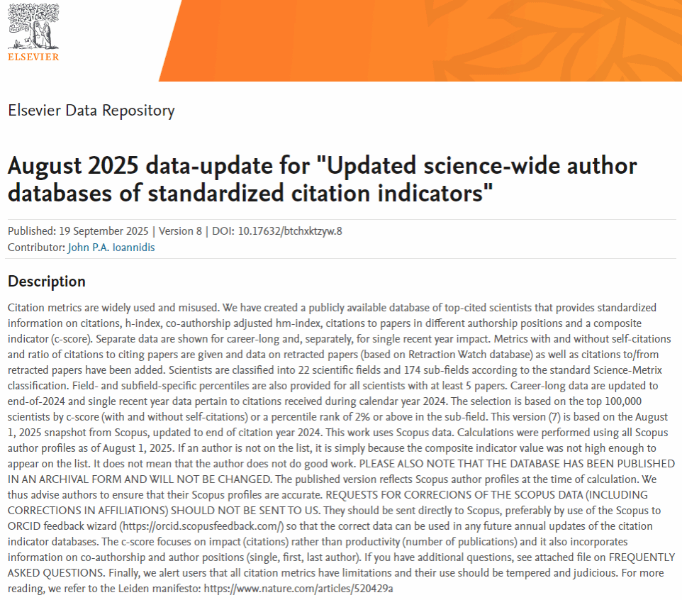 全球前2%頂尖科學(xué)家榜單基于Scopus數據庫詳盡的引用數據分析,通過(guò)綜合考慮論文被引次數、H指數、HM因子、單獨或第一作者的文章引用數等綜合指標,從全球近700萬(wàn)名科學(xué)家中遴選出世界排名前2%的科學(xué)家,涵蓋22個(gè)領(lǐng)域和174個(gè)子領(lǐng)域。其中,“終身影響力”榜單統計科學(xué)家職業(yè)生涯期間的綜合表現,“年度影響力”榜單則聚焦上一年度的學(xué)術(shù)影響力。