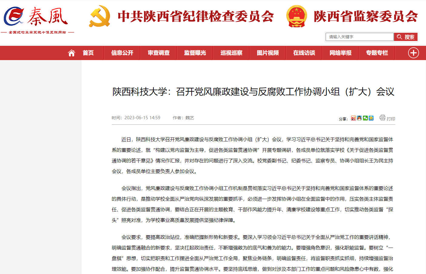 秦風(fēng)網(wǎng)報道我校召開(kāi)黨風(fēng)廉政建設與反腐敗工作協(xié)調小組(擴大)會(huì )議